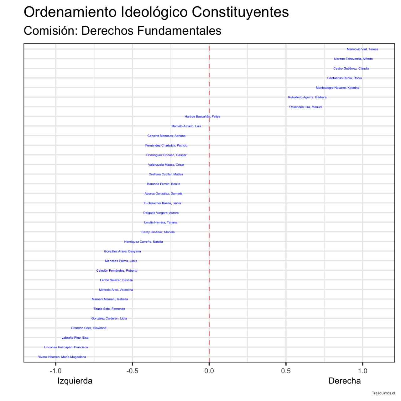 Concluye: “Derechos Fundamentales es representativa de lo que pasa en el pleno. Tiene una progresión de izquierda a derecha, en donde se demuestran claramente los 3/3. Y dos de esos tercios están hacia la izquierda como lo demuestra el gráfico con el comportamiento de los convencionales de la comisión en el pleno”.